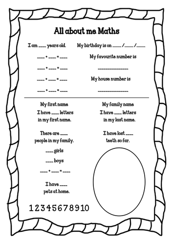 All about me Maths | Teaching Resources File previews. pdf, 299.66 KB. A sheet for children to complete all about maths concepts related to them (number of letters in name, number of boys/girls in family, house number etc) Tes classic free licence. Report this resource to let us know if it violates our terms and conditions.